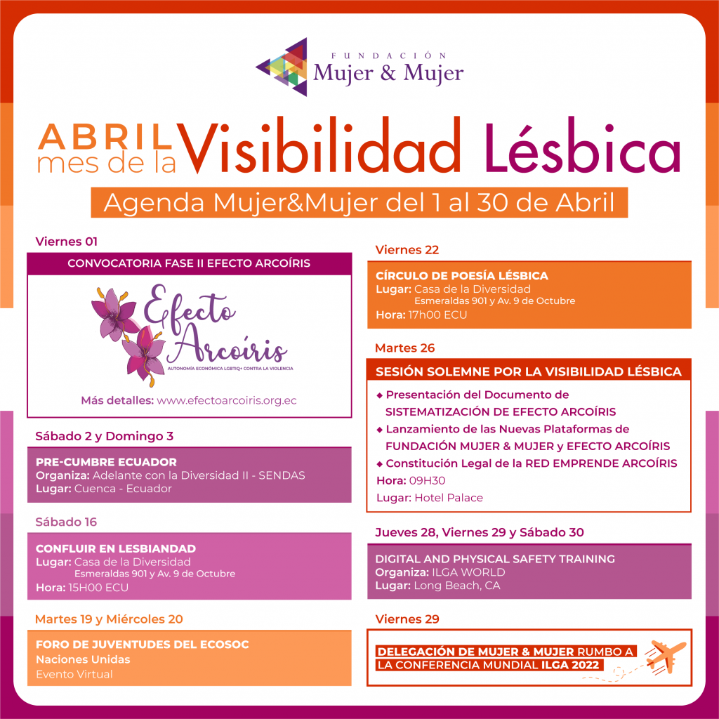 En el marco del 26 de Abril, Día Internacional de la Visibilidad Lésbica, Fundación Mujer & Mujer ha preparado una agenda de actividades en la ciudad de Guayaquil durante todo el mes para compartir con cade une de ustedes y poder celebrar esta fecha emblemática para nosotras las mujeres lesbianas.